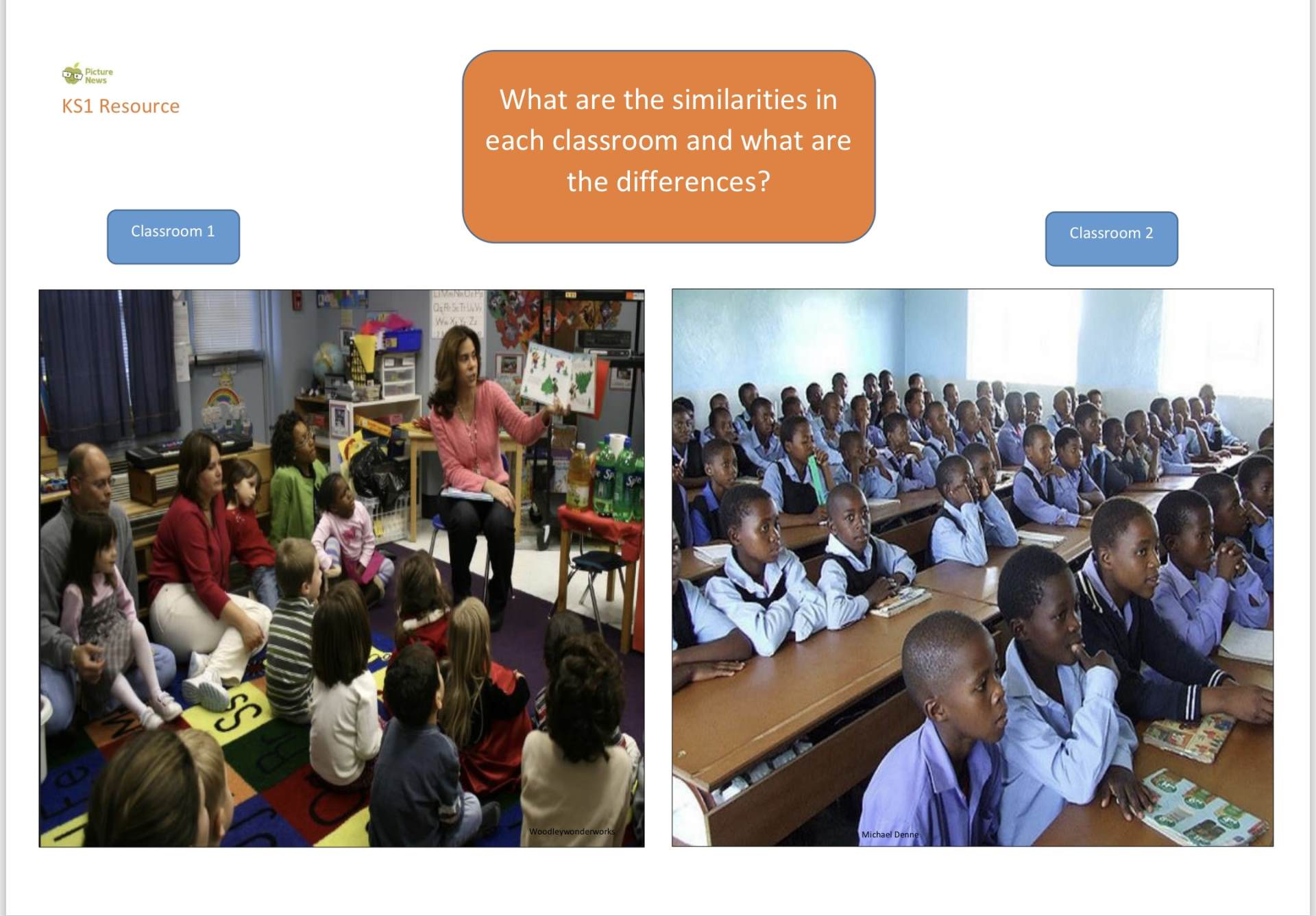 Look at the KS1 resource and the two images -talk about what is similar and the differences in each classroom. Talk about the sizes of the rooms, the resources and numbers of children.Explain that some countries don’t have as much money for their schools, but this doesn’t stop a lot of learning taking place! Ask the children what they think is the most important thing we need to learn – talk about the importance and value of our teachers!