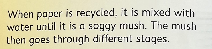 Today we will be writing our own page for an information book. We are going to use the information about recycling paper from the book. Don’t forget to use the words: