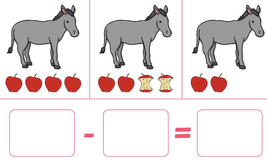 On the farm, the donkey has 4 apples. He eats 2 of the apples. How many apples are left?