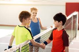 These children are shaking hands after playing a game together.