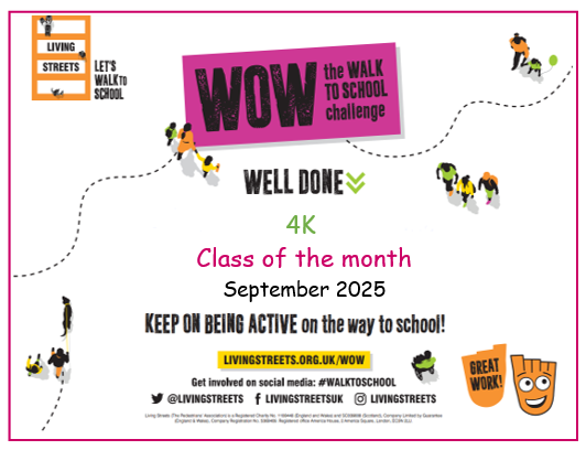 To encourage and reward our pupils for their active journeys to school, we take part in the WOW Walk to school challenges, supported by the Walk to School Outreach project that is funded by Active Travel England (via Department for Transport).