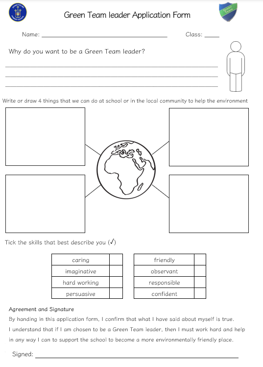 To become a Green Team leader, pupils from Years 2, 3, 4, 5 and 6 had to fill in an application form. After looking through the applications, successful pupils were then invited to an interview with the duty bearers and Green team leaders. Following the interviews, the successful applicants received a visit from either Mrs Ayres or Miss Cock to congratulate them on becoming a Green Team leader.