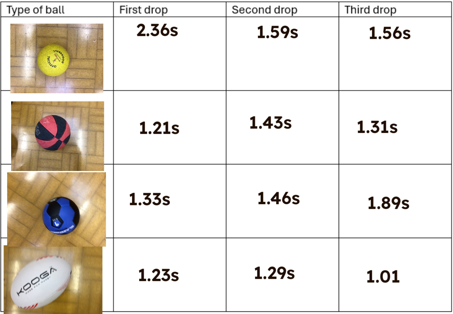 In science, we tested how gravity works by dropping four balls of different sizes and weights from the same height. Each ball was dropped three times to make the test fair. We used a stopwatch to measure how long it took each ball to hit the ground. Afterwards, we looked at our results tables and used them to draw our finding.