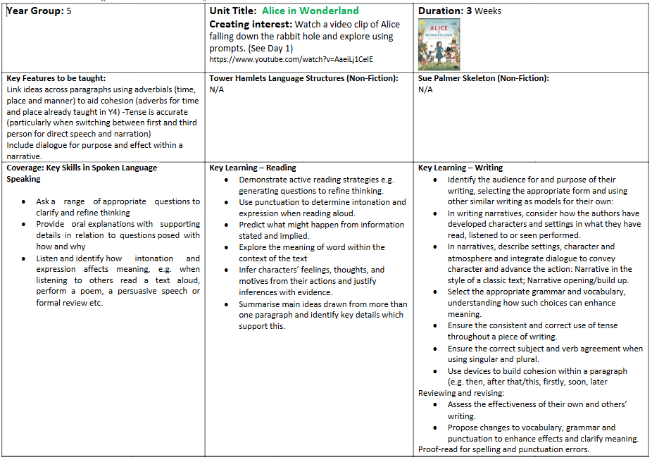 This half term, our English is centred on a retold version of Alice in Wonderland. Children will use the story to practice key comprehension skills, explore how writers create characters and settings, and learn how to link ideas and use dialogue in their own writing. They will then use the book's plot structure as a model to craft a new story set in a different world.