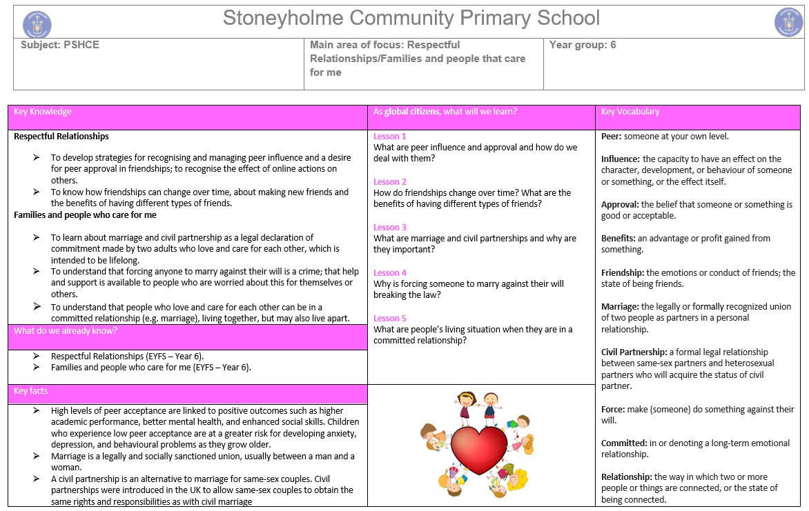This half term in Year 6, we will be learning about respectful relationships and families as part of our Personal, Social, Health and Economic (PSHE) education. Children will explore what makes a healthy and respectful relationship, including the importance of kindness, communication, trust and equality. We will discuss how families can look different for different people and celebrate the diversity within our community.