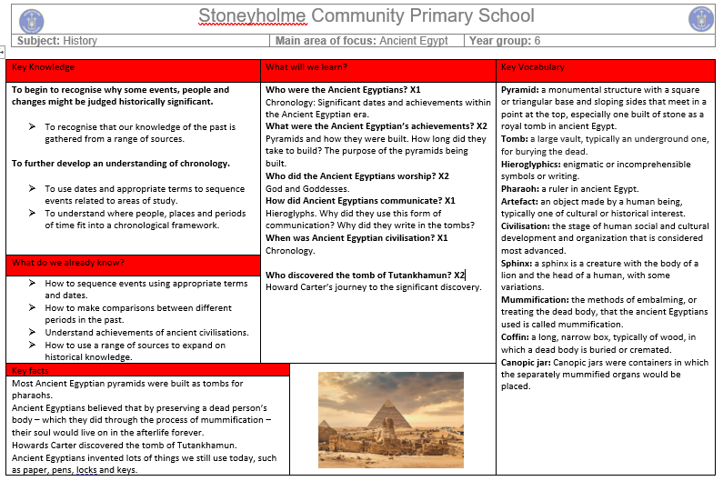 This term, Year 6 will travel back over 5,000 years to explore the fascinating world of Ancient Egypt! We will discover how this early civilisation grew along the banks of the Nile River and why it became one of the most powerful kingdoms in the ancient world.
