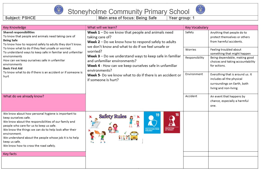 In Year 1, we will be exploring who needs taking care of and how we do that. We will be understanding what makes a safe and unsafe environment and how to keep ourselves safe within those.