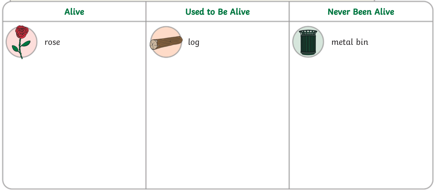 ⚪ Never been alive – things that were never alive at all. They were made from materials like plastic, metal, or stone.
