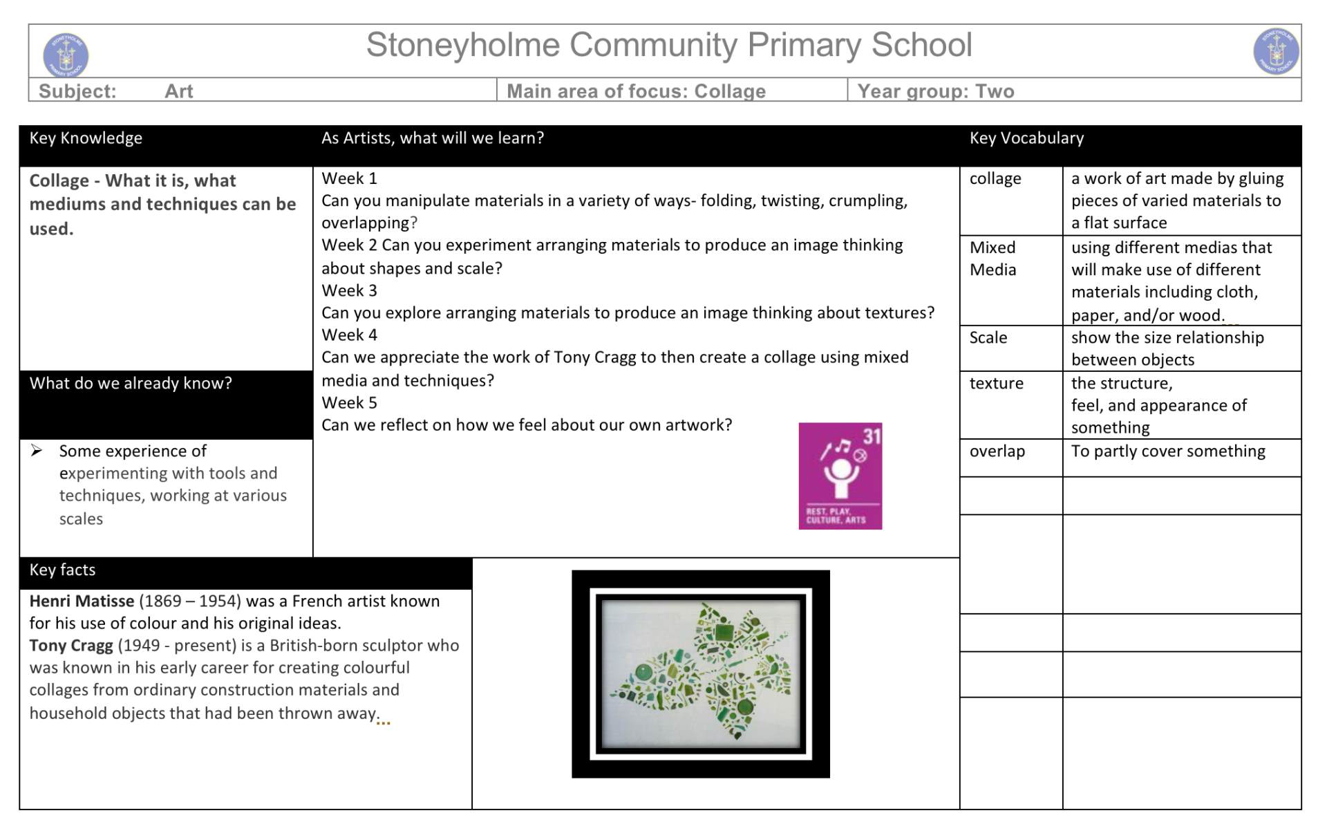 As artists, Year 2 will be learning about collage and exploring how artists use different materials to create exciting artwork. We will study the work of Tony Cragg and discuss how he transforms everyday and recycled objects into interesting shapes and sculptures.