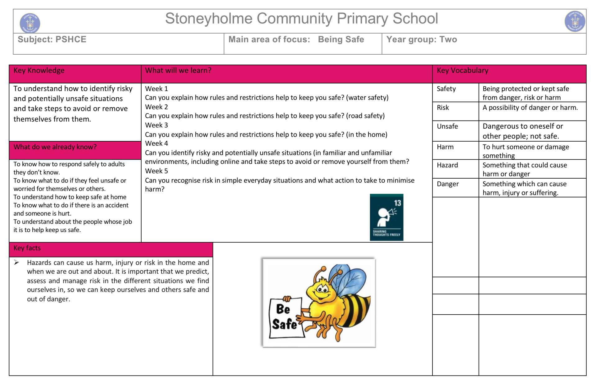 Year 2 will be learning about staying safe and understanding how to keep themselves safe in different situations. The children will explore how to recognise safe and unsafe situations, both at home and in school, and learn about the importance of making sensible choices.