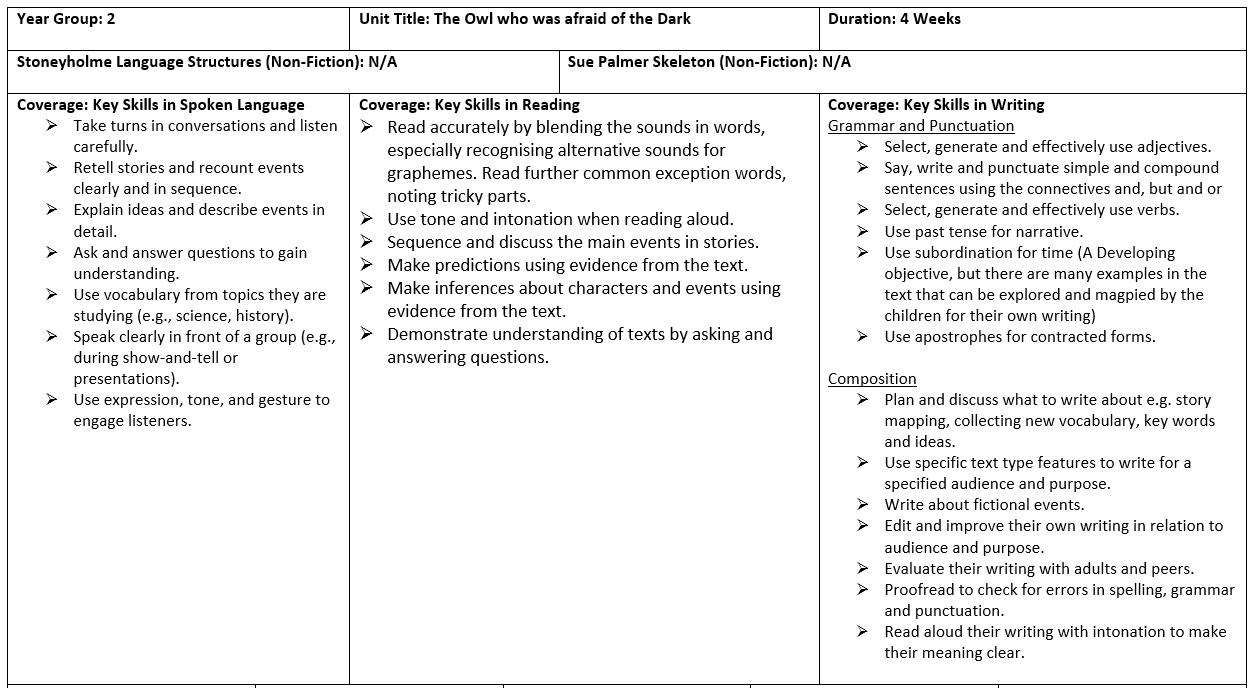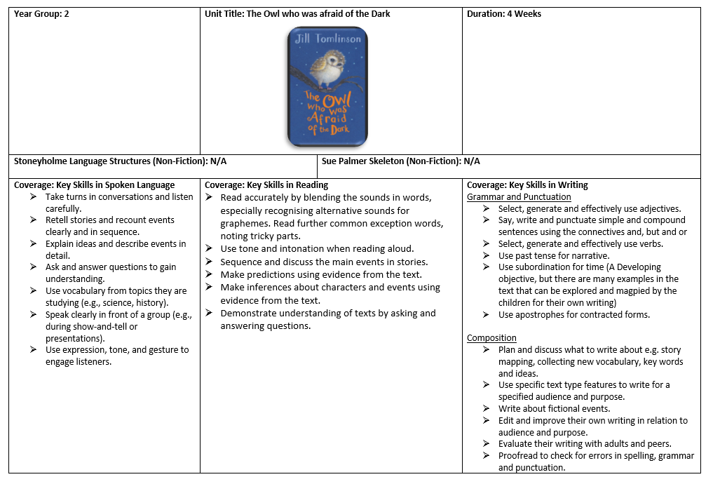 This term, Year 2 will continue reading the story The Owl Who Was Afraid of the Dark as part of our English learning. The children will explore the adventures of Plop the little owl and use the story to develop their reading, writing and comprehension skills.