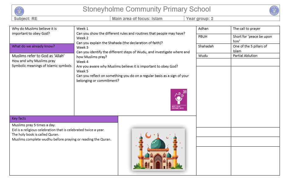 This term, Year 2 will be learning about Islam and exploring what is important to Muslim people. The children will find out about the beliefs and practices of Islam.