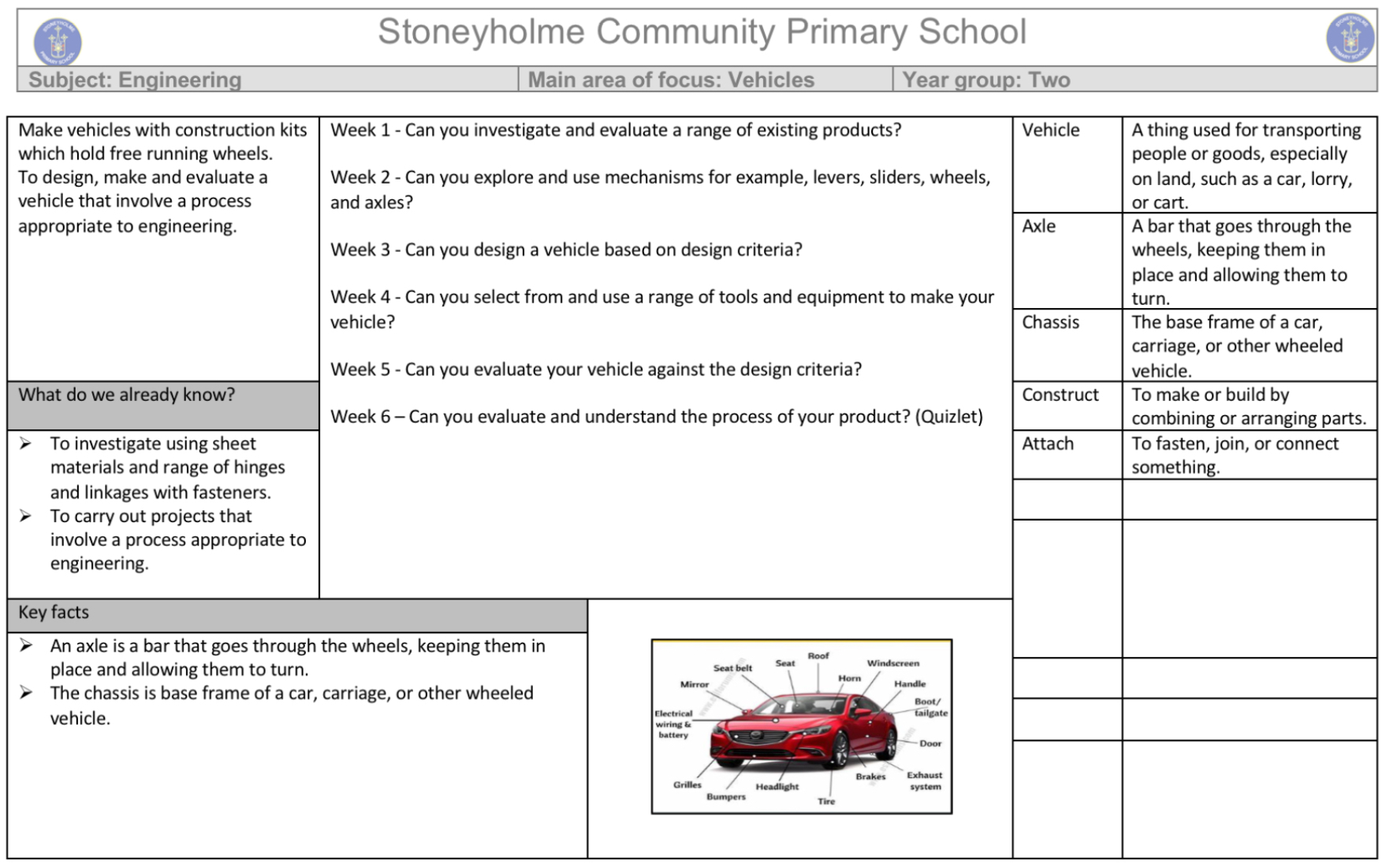 This half term, Year 2 will be exploring how vehicles work by investigating wheels, axles and chassis. Children will design and build their own moving model using construction kits and simple tools. This Knowledge Organiser highlights the key vocabulary and ideas they’ll be learning, so you can talk about the project together at home.