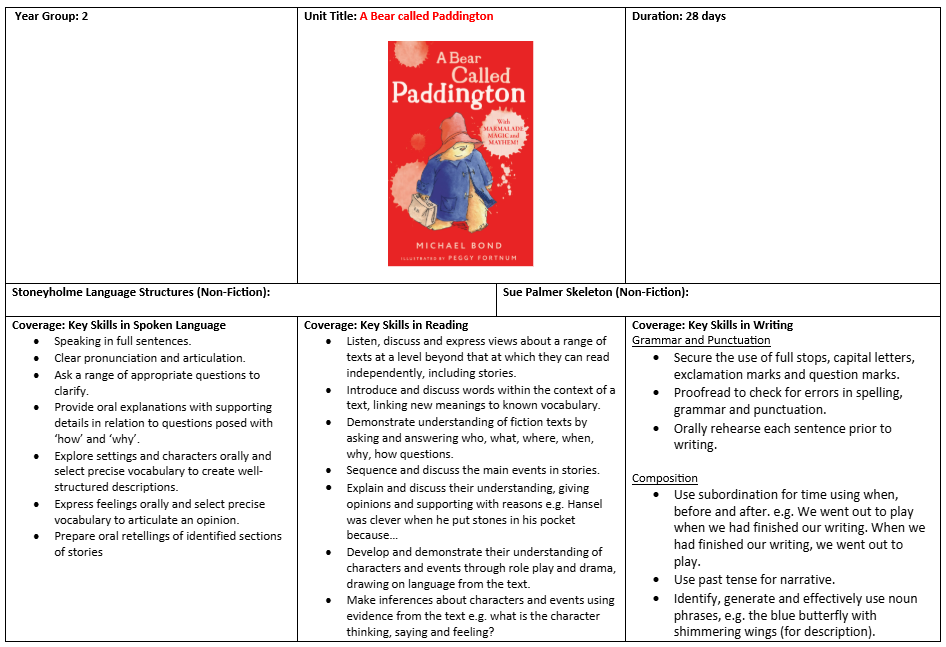This half term, Year 2 will be exploring A Bear Called Paddington while developing key skills in spoken language, reading and writing. The children will practise speaking clearly and confidently by sharing ideas, asking questions and joining in with discussions about the story. In reading, they will work on understanding the text, making predictions and answering questions about the characters and events. In writing, the children will develop their ability to form sentences, use punctuation correctly and write their own ideas inspired by Paddington’s adventures. We are excited to see their confidence and creativity grow!