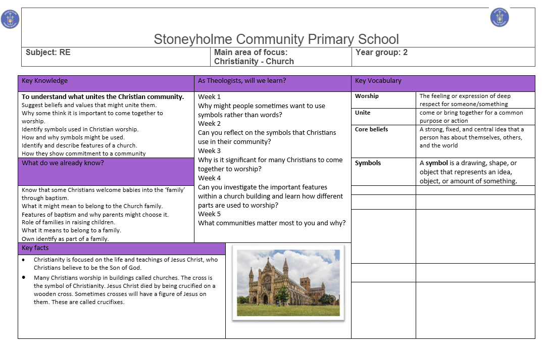 This half term, Year 2 will be learning about Christianity, with a focus on the church. The children will explore what a church is and why it is a special place for Christians. They will learn about what happens inside a church, including celebrations, prayers and songs. We will also look at important features of a church, such as the altar, cross and pews. The children will be encouraged to ask questions and share their ideas as they learn about different beliefs and traditions.