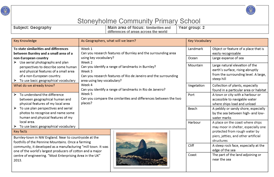 This half term, Year 2 will be learning about similarities and differences between areas of the world, focusing on Burnley and Rio de Janeiro. The children will explore what each place is like, including the weather, buildings and local environment. They will compare how people live in both locations and think about what is the same and what is different. We will also look at maps and photographs to help us understand these places better. The children will be encouraged to share their ideas and develop their understanding of the wider world.