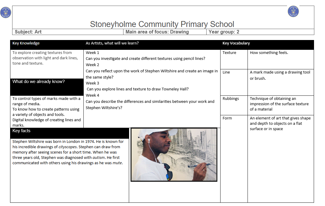 This half term, Year 2 will be learning about art inspired by Stephen Wiltshire, a famous artist known for his amazing city drawings, and they will be using Towneley Hall as inspiration. The children will explore how Stephen Wiltshire observes buildings and streets carefully before creating detailed artwork, and they will practise drawing parts of Towneley Hall, paying attention to shapes, lines and details. We will also look at different ways to add colour and make their drawings look realistic. The children will enjoy using their creativity and developing their confidence as young artists.