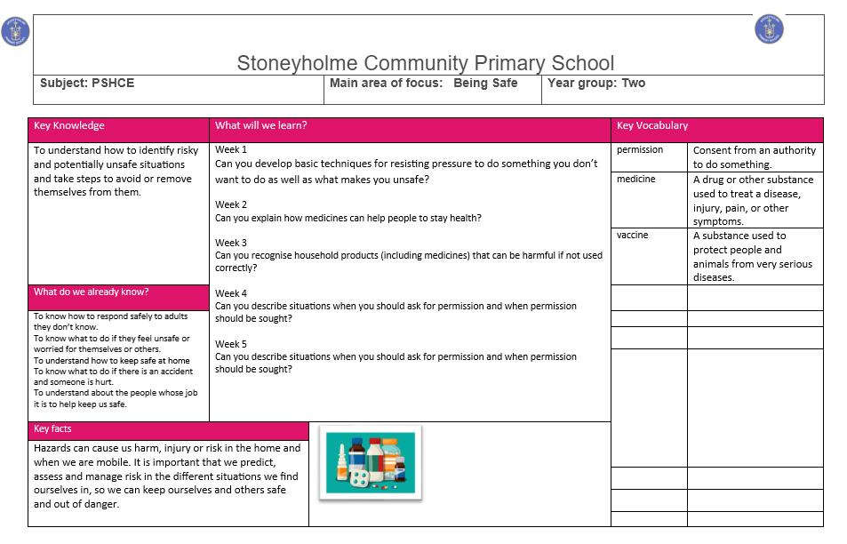 This half term, Year 2 will be learning about how to stay safe. The children will explore how to resist pressure from others and make good choices for themselves. We will also talk about medicines and other things that can be harmful if they are not used correctly. The children will learn the importance of always asking for permission from a trusted adult before trying new things. Through discussions and activities, they will practise making safe choices and understanding why it is important to look after themselves.
