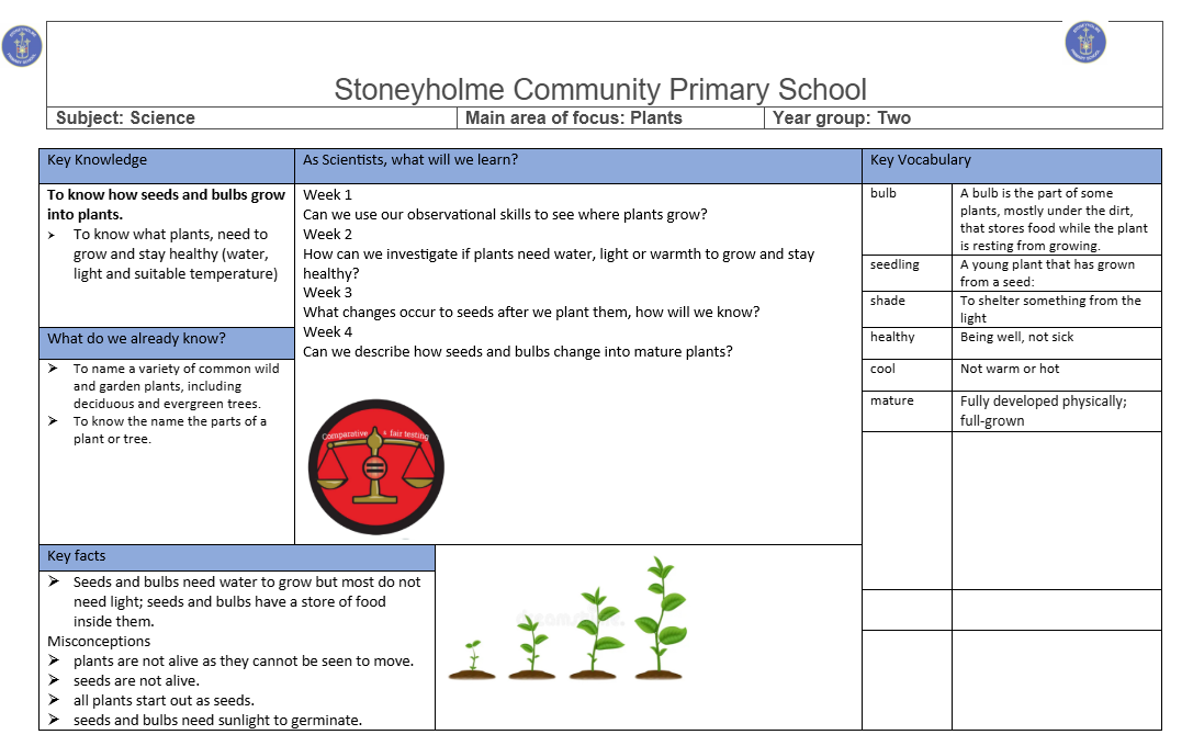 This half term, Year 2 will be learning all about plants. The children will explore how plants grow and what they need to stay healthy, such as water, sunlight and soil. They will learn about different parts of a plant, including roots, stems, leaves and flowers, and understand what each part does. We will also look at how seeds grow into plants and observe changes over time. The children will enjoy hands-on activities and develop their curiosity about the natural world.