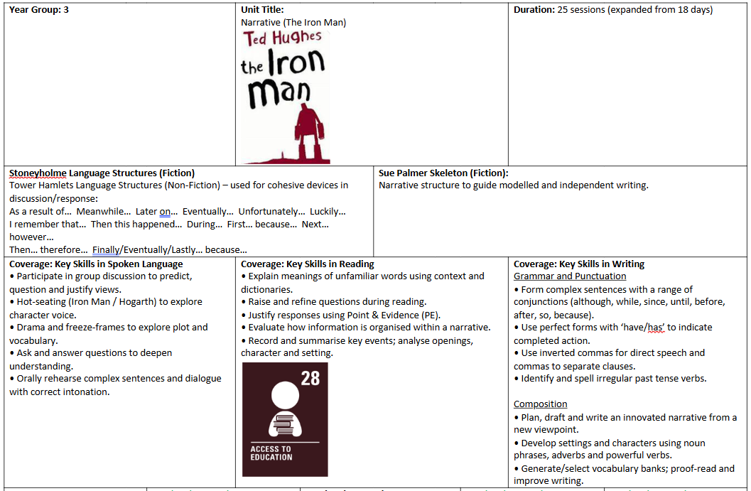In English we will be planning and writing a narrative based on the story of The Iron Man by Ted Hughes. Children will be dissecting different narratives to enhance their understanding of the format of a narrative, specifically focusing on the setting, powerful adjectives and verbs.