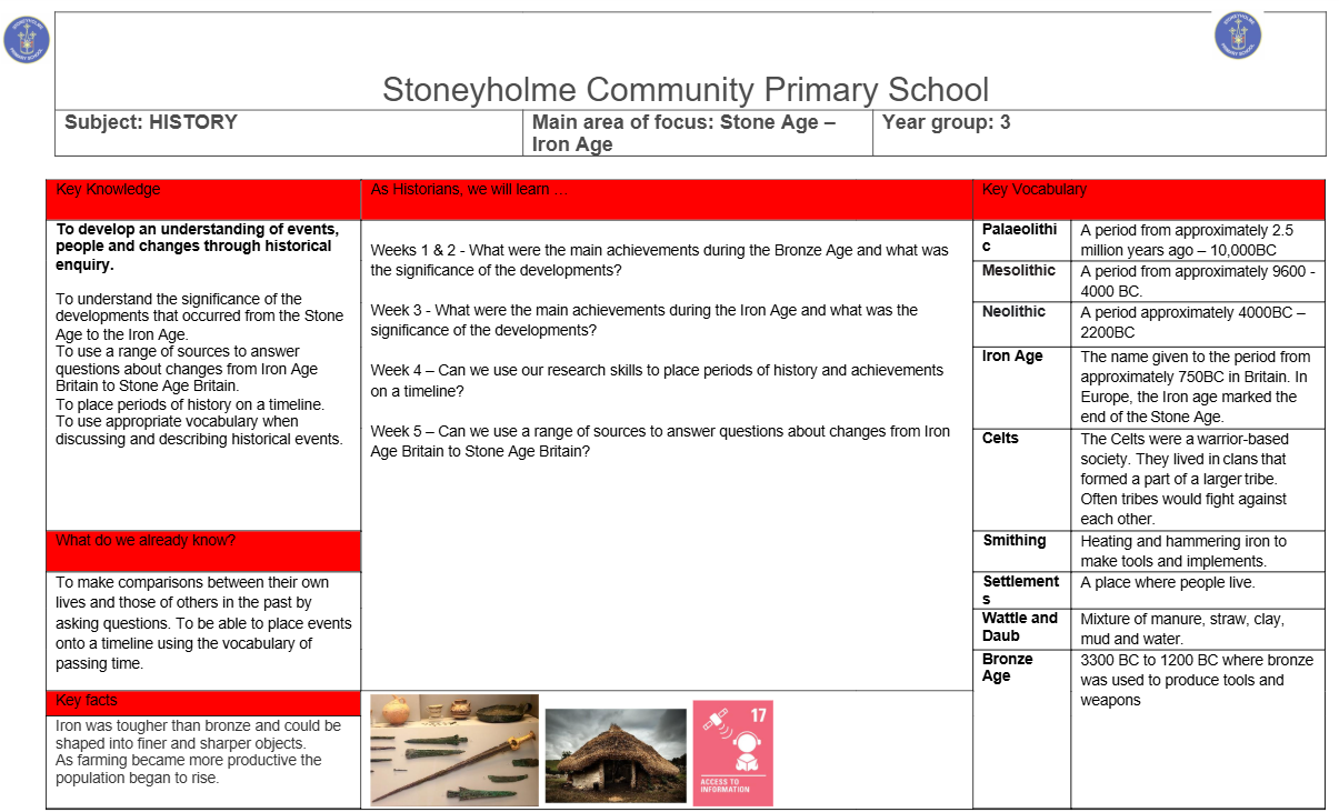 As Historians, we will be travelling back in time to the Bronze Age and the Iron Age. We will be exploring the similarities and differences in the way that people lived. We will create a timeline of events from the Stone Age to the Iron Age.