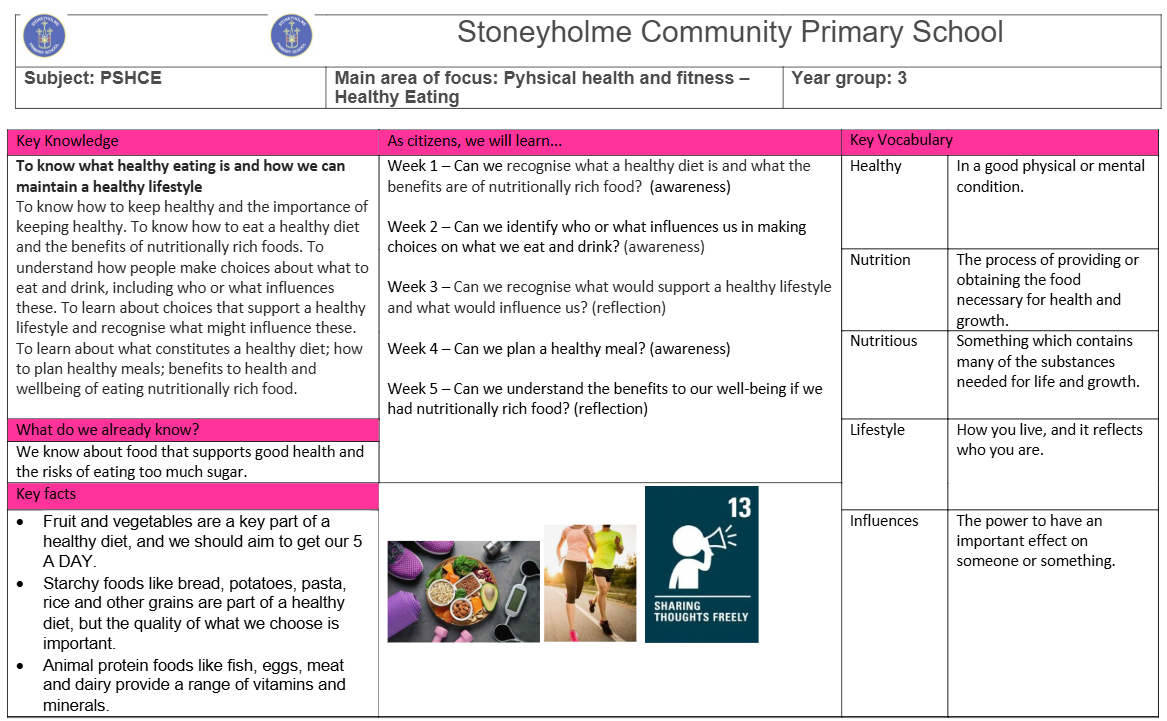 As citizens, we will recognise what a healthy diet is and the benefits of nutritionally rich food. We will also identify who and what influences us in making choices on what we eat and drink.