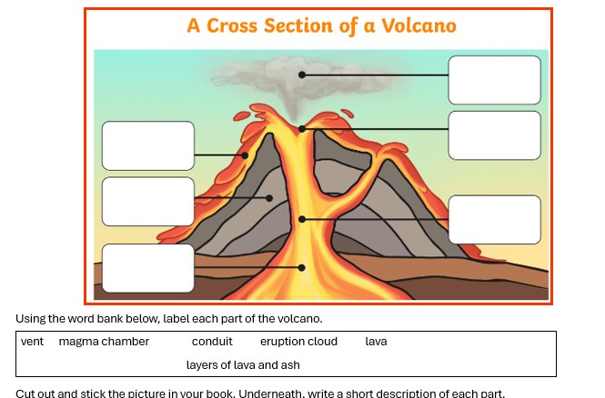 LC: To name the key parts of a volcano and explain them.