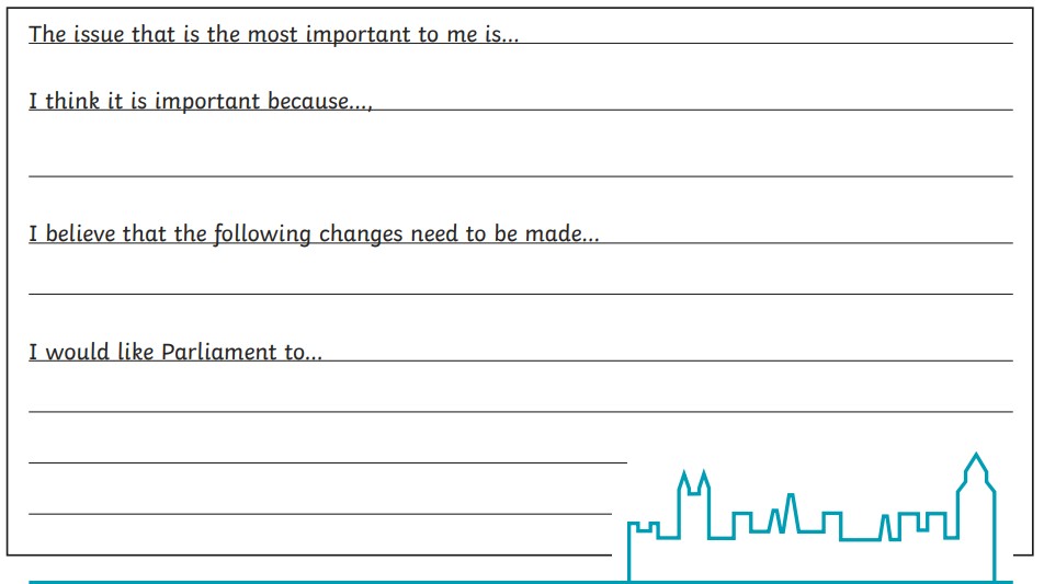 Now decide on one issue that is very important to you, and complete this task. Think about why it is important to you. Think about what you would like the government to do to tackle this issue.