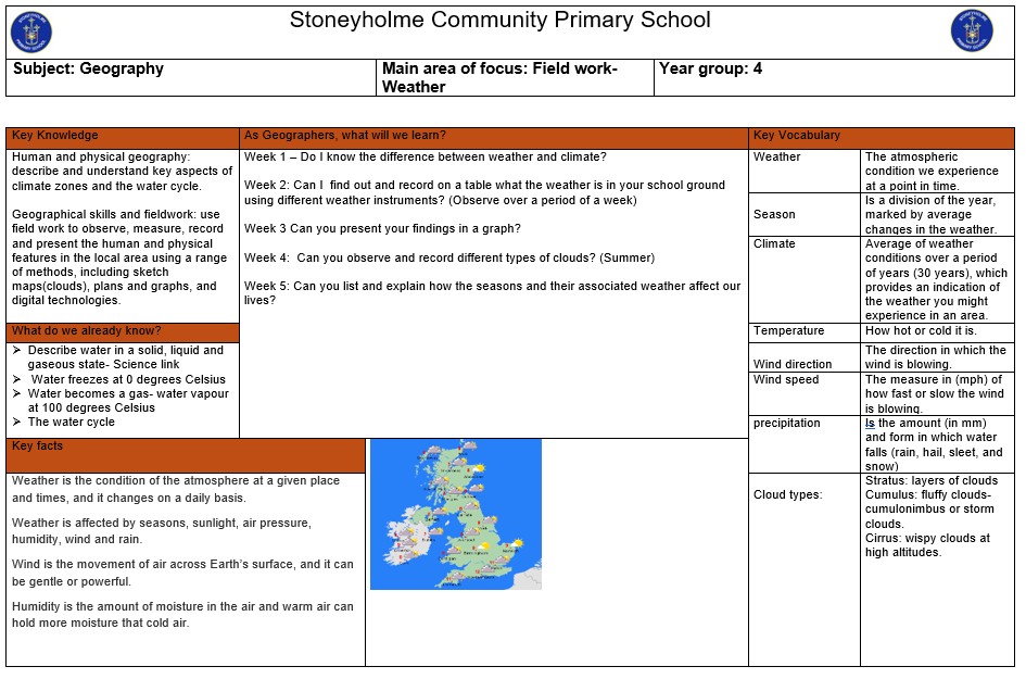 As geographers, we will be learning about the role of meteorologists and taking on that role ourselves! We will know what instruments are used to measure different weather conditions and how to use them. We will record our findings on line graphs, using our prior learning in maths to support us. We will explore how seasonal changes impact on people.