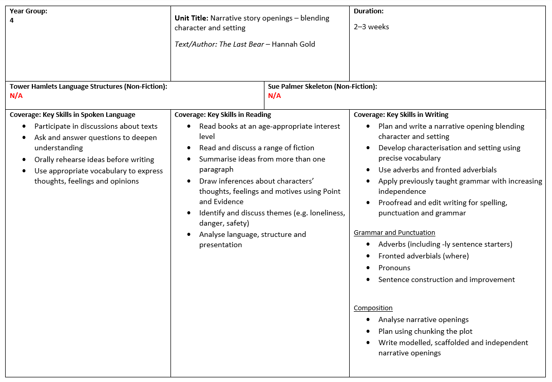 As Writers, we will explore how stories begin by blending character and setting to engage the reader. Using The Last Bear, we will read and discuss exciting openings, developing our understanding of atmosphere, character, and themes such as loneliness, danger, and safety.