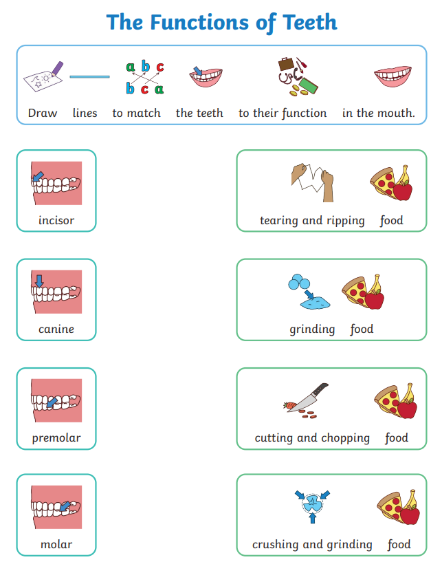 Interesting fact: When you have your teeth checked by a dentist, you may have heard them say lots of letters and numbers. The numbers refer to your adult teeth and the letters to your milk teeth. Letters and numbers start from the back of your mouth and go to the front. So a wisdom tooth would be eight, the incisor on that side would be one. As children have fewer molars and premolars and no wisdom teeth, milk teeth are labelled from the back E D C B A. So the back molar would be E and the incisor on that side would be A.