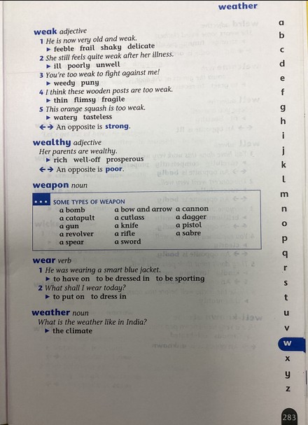 Watch me look up the word weak in the thesaurus. Where should I start looking?
