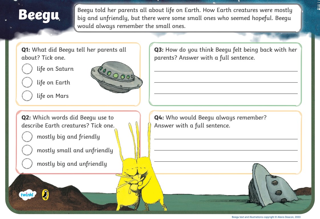 Shared read this part of the Beegu story with your teacher, then help her answer the questions.