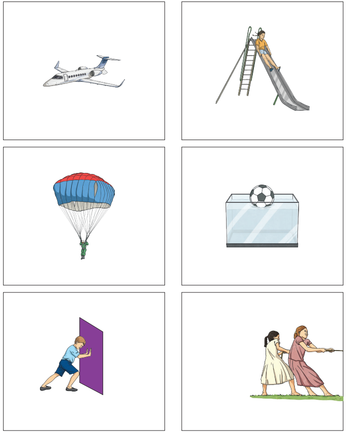 Label and draw arrows on the pictures below to show the forces acting in them.
