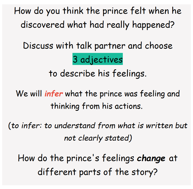 LC: to infer a character's thoughts and feelings from their actions and justify with evidence from the text