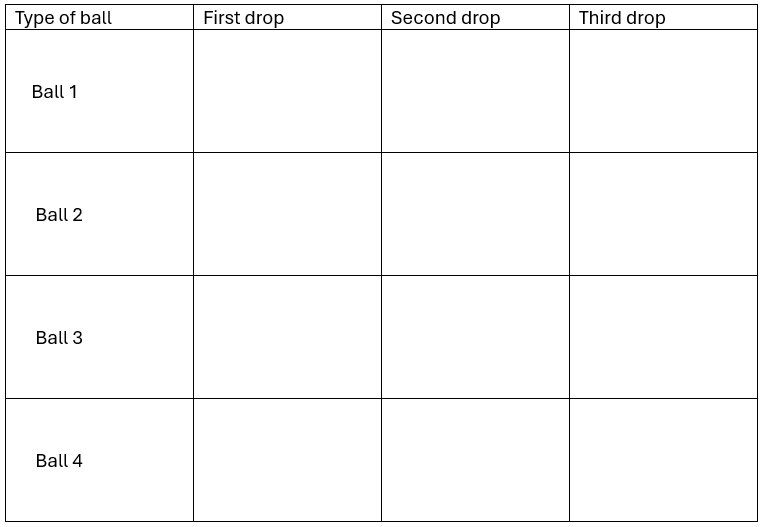 To test how gravity works, we will drop four balls of different sizes and weights from the same height. Each ball will be dropped three times to make our test fair. We will use a stopwatch to measure how long it takes each ball to hit the ground. Afterwards, we will compare the times to see what we notice about gravity.