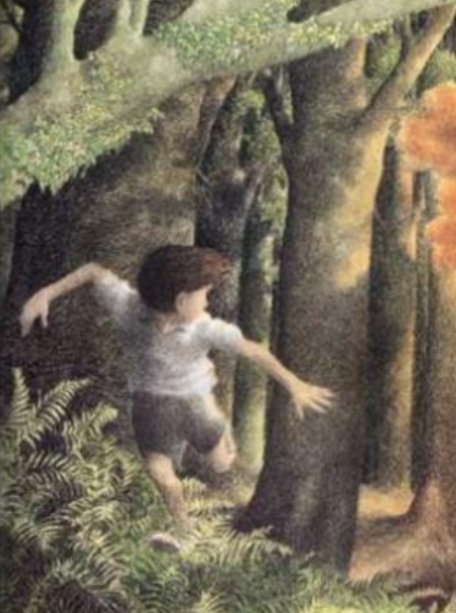 Little Billy was running with the speed of an arrow, but each time he glanced back over his shoulder the puffs of orange-red smoky-breath had got closer. They were so close now he could feel the wind of them on the back of his neck. And the noise! It was deafening in his ears, this fearsome swooshing whooshing whiffling panting noise.Woomph-woomph, it went. Woomph-woomph, woomph-woomph! Woomph-woomph! It was like the noise made by a steam locomotive pulling out from a station. Then suddenly he heard another noise that was somehow more fearsome still. It was the pounding of gigantic galloping hooves on the floor of the forest. He glanced round again, but the Thing, the Beast, the Monster, or whatever it was, was hidden from his sight by the smoke it shot out as it galloped forward. The smoky-breath was billowing all around him now. He could feel its hotness. Worse still, he could smell its smell. The smell was disgusting. It was the stench that comes from deep inside the tummy of a meat-eating animal. “Mummy!” he cried out. “Save me!” Suddenly, directly in front of him, Little Billy saw the trunk of an enormous tree. This tree was different from the others because it had branches hanging down very low. While still running, he made a frantic jump for its lowest branch. He caught it and pulled himself up.