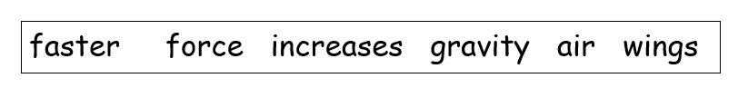 b) w _ _ _ _ at a faster and c) f _ _ _ _ _ rate. This produces an upward d) f _ _ _ _ , called lift, on the wings. When this force becomes greater than the downward force of e) g _ _ _ _ _ _ , the glider can stay up in the f) a _ _ .