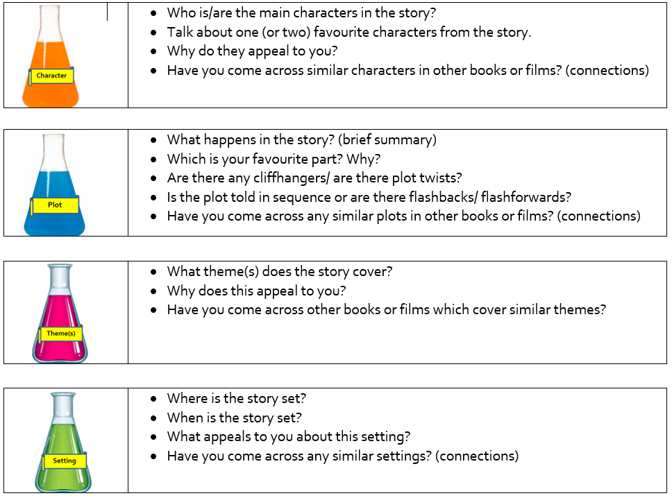 Your teacher will give you one element of fiction to focus on and you should answer the questions in complete sentences in your book.