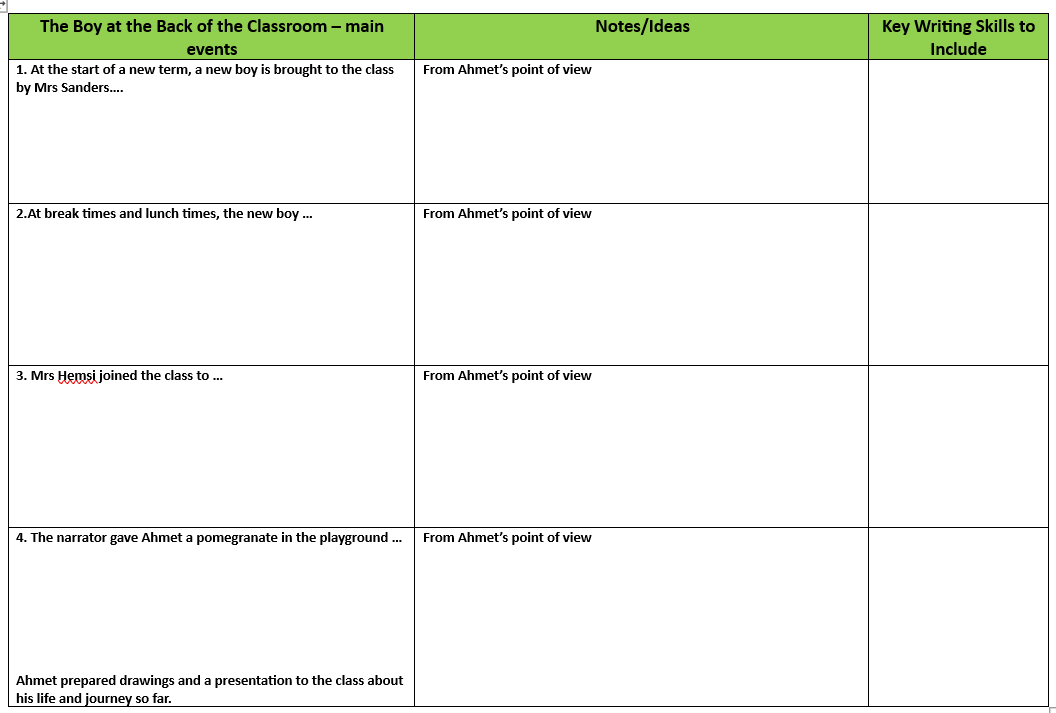 We are going to 'chunk' the plot so far into 4 sections so we can retell the story so far from Ahmet's first person perspective.