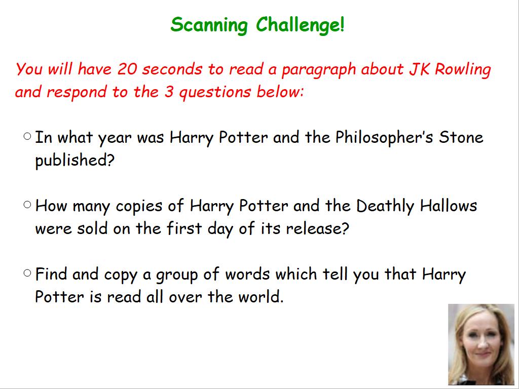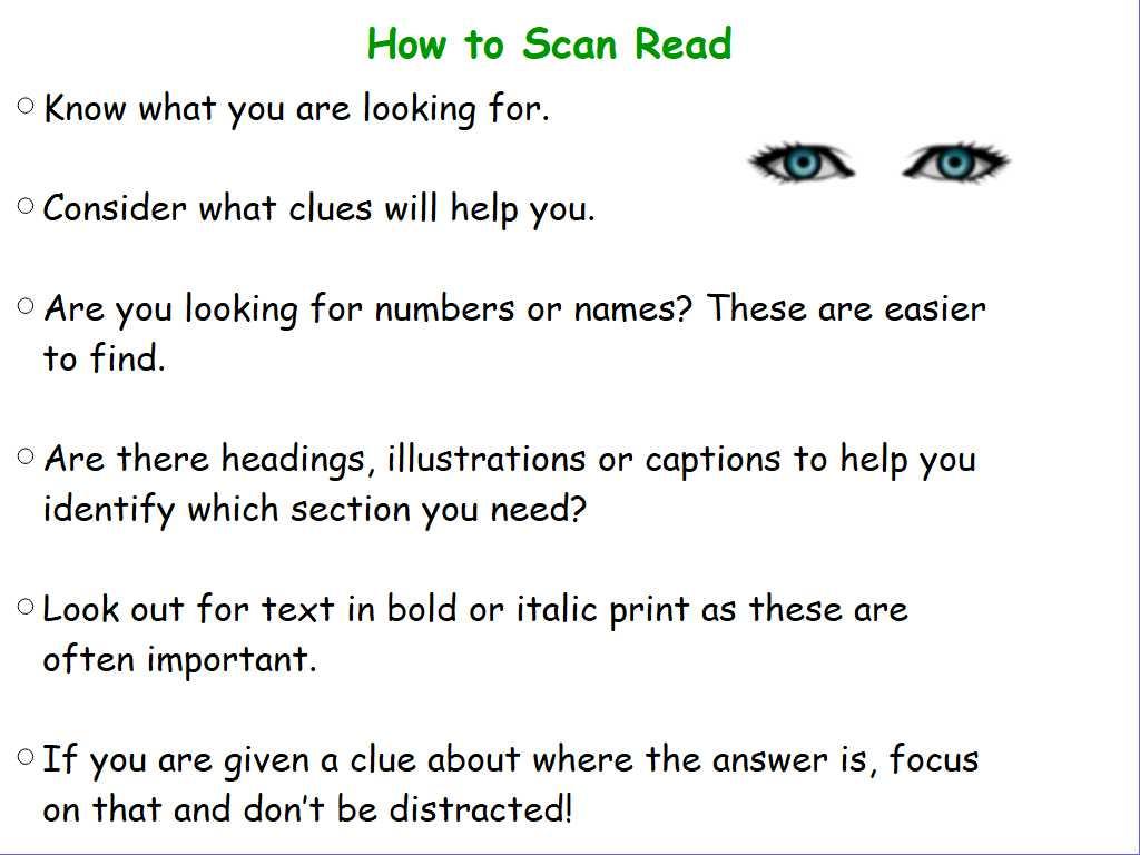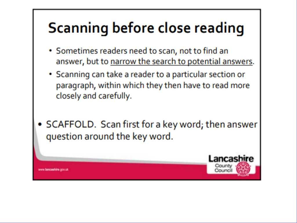LC: To use skimming, scanning and close reading strategies to locate specific information.