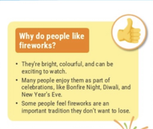 Sometimes people celebrate with fireworks. On Wednesday it will be a special day called Bonfire Night. Some people like to set off fireworks.