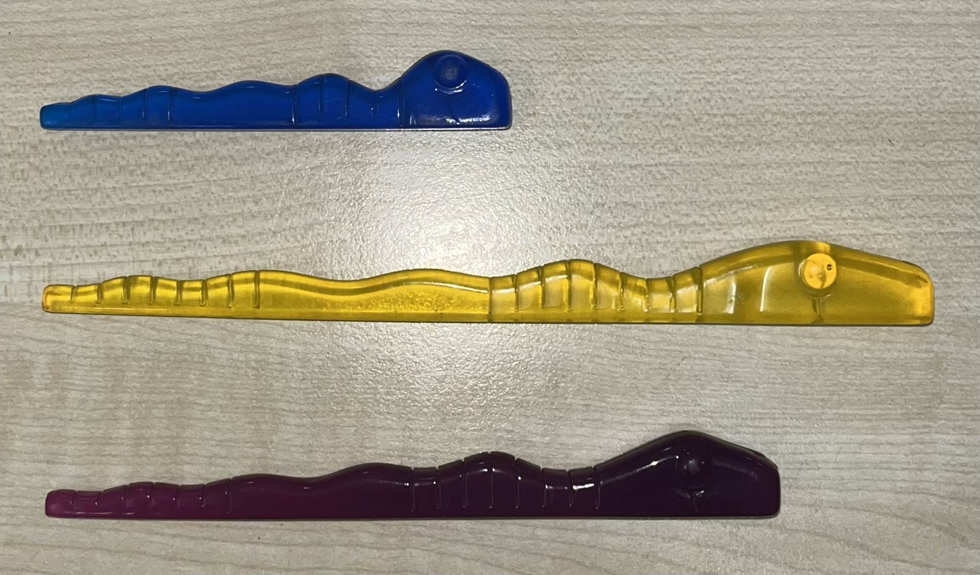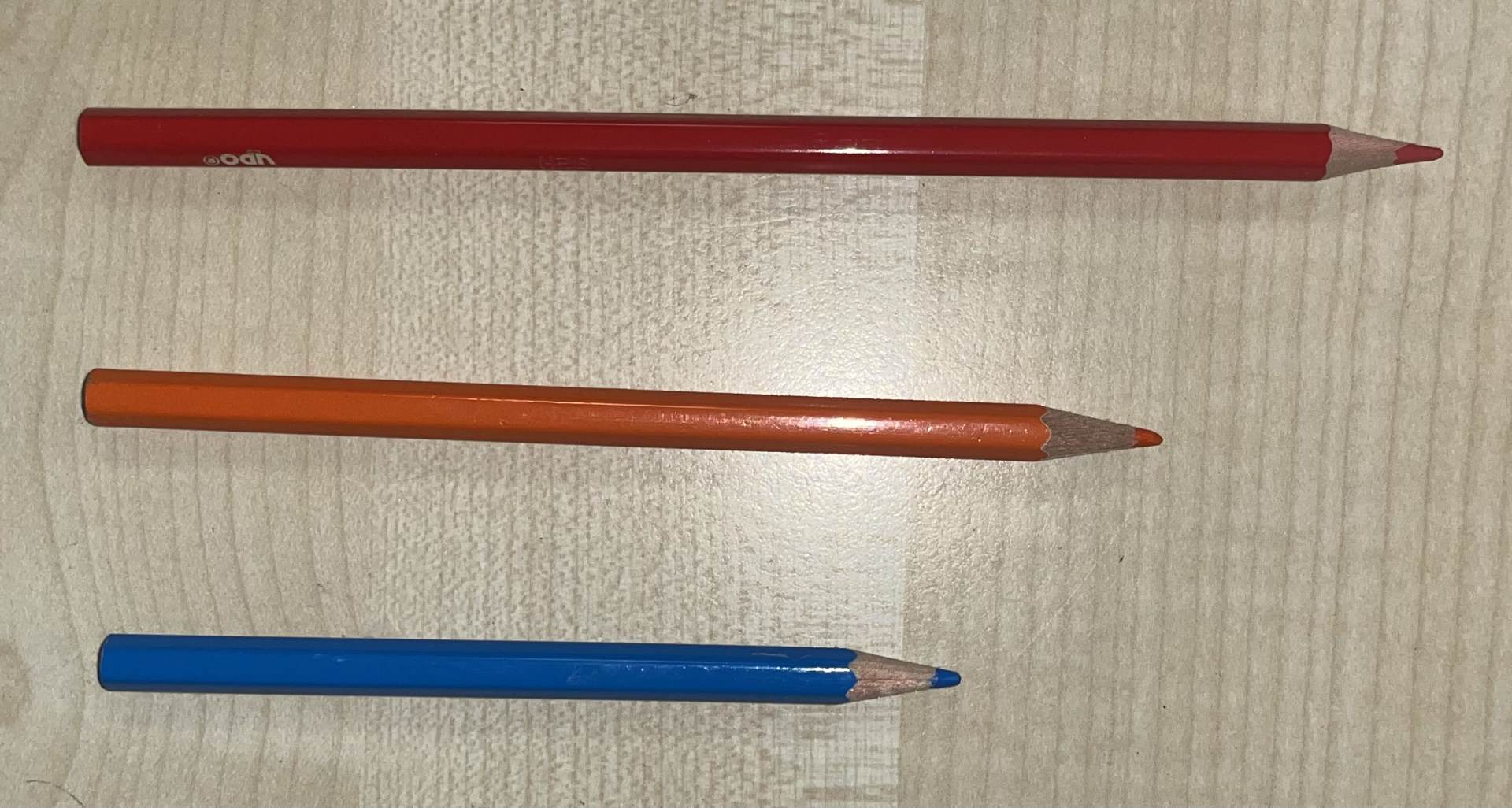 The orange pencil is longer than the blue pencil but shorter than the red pencil.