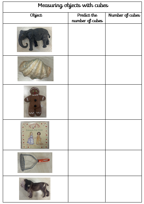 Today, we are going to do the same activity using the weighing scales. Before we weigh each object, I want you to predict how many cubes you think they will weigh? Then we will measure them with the cubes.