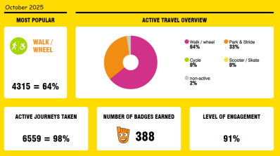 To enable us to monitor our progress through the challenges, our pupils record their journey to school every morning on the WOW travel tracker and at the end of the month if they have recorded three or more active journeys every week, they are awarded a badge. The travel tracker also allows them to monitor their own progress and how their class and the school are doing on the leaderboards.
