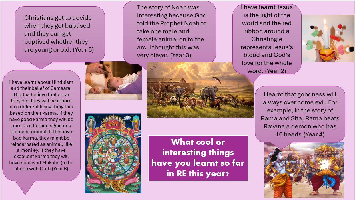 - Throughout Religious Education children acquire the necessary knowledge and skills to make sense of the complex world in which they live so that they can respect religious and cultural differences.