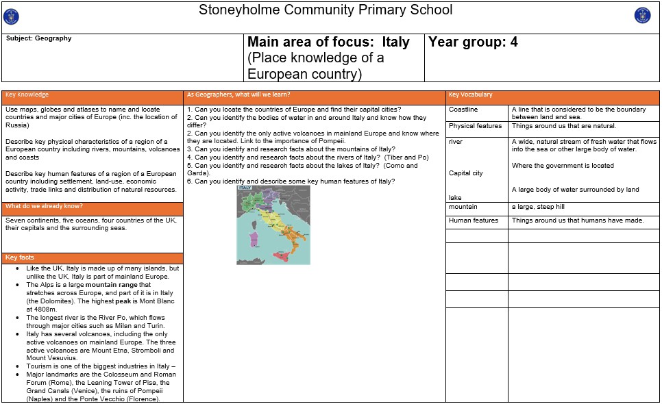 As Geographers, we will be undertaking a place knowledge study of a European country - Italy. Using a variety of sources and research techniques, we will explore the major physical and human features of the country and will present our findings in different ways.