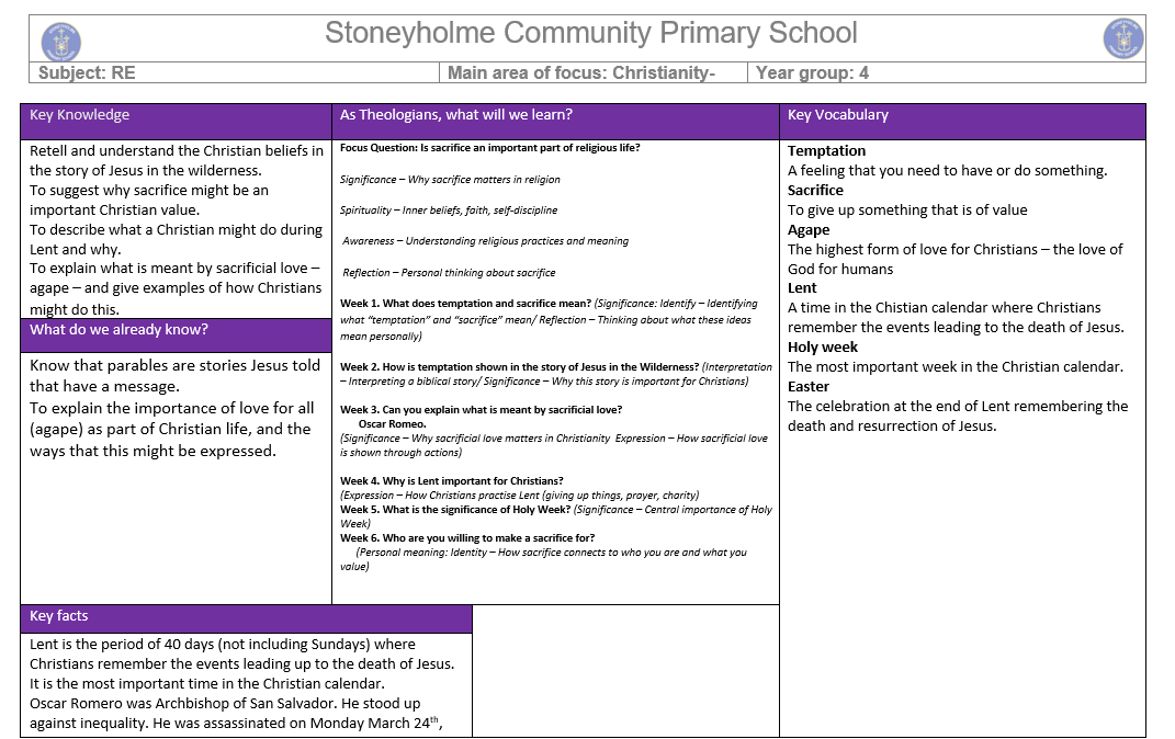 Children will discover why sacrifice is an important value for Christians, especially during Lent, when many Christians choose to give things up and do kind acts to help others. The unit also introduces the idea of agape (sacrificial love) and how Christians try to show this love by caring for others, sharing, forgiving, and helping people in need.