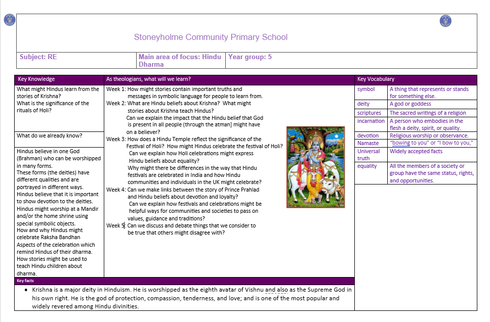 In RE, we will study how Hindus might learn from the stories of Krishna. We will explore the significance of rituals for Hindus, such as the Festival of Holi.