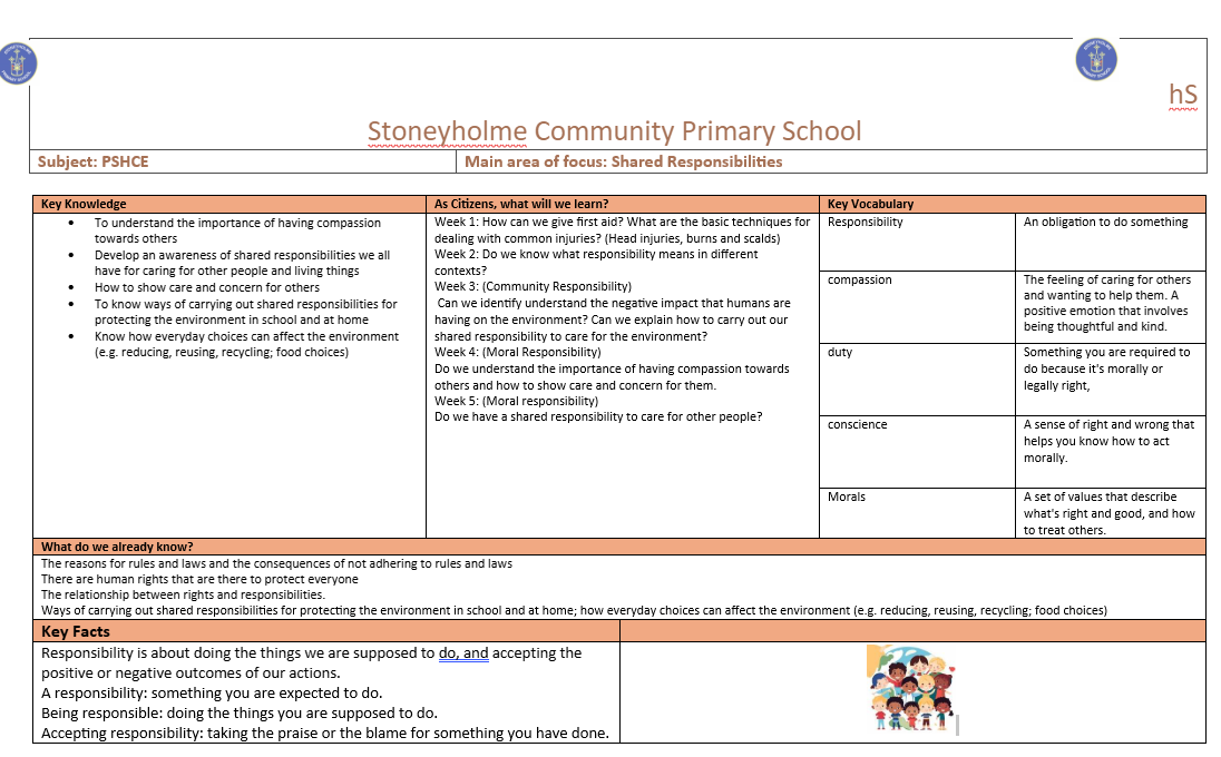 Our focus in PHSCE this half term will be understanding the shared responsibilities that we have as members of our community. We will explore the importance of compassion towards others and understand ways of carrying out our shared responsibilities at school and at home.